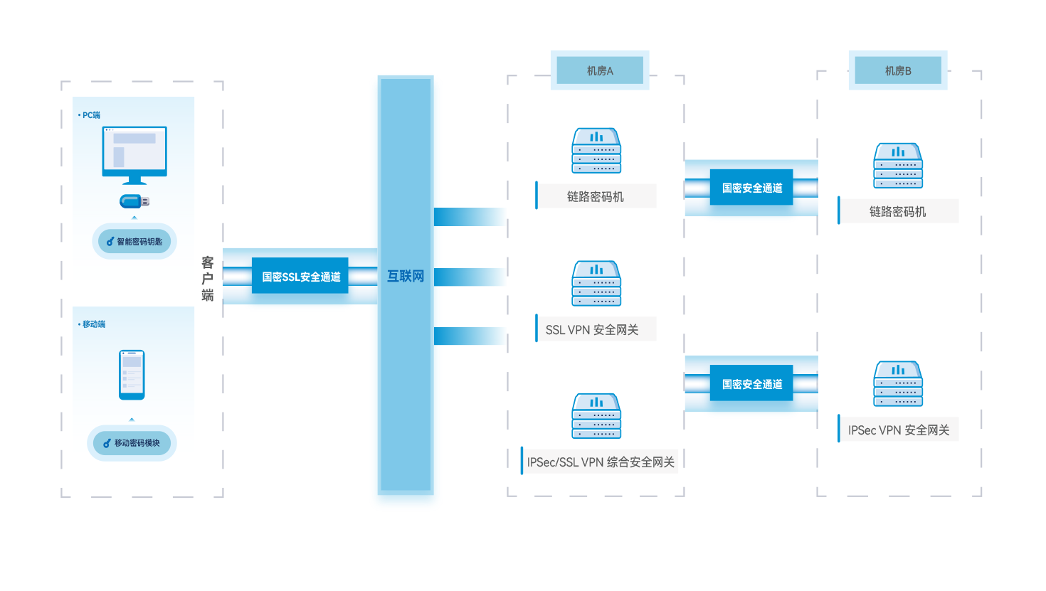 智能密码钥匙和综合安全网关解决终端到机房的身份鉴别和网络通信安全问题,IPSec/SSL VPN 综合安全网关和链路密码机解决数据中心之间的身份鉴别和网络通信安全问题。