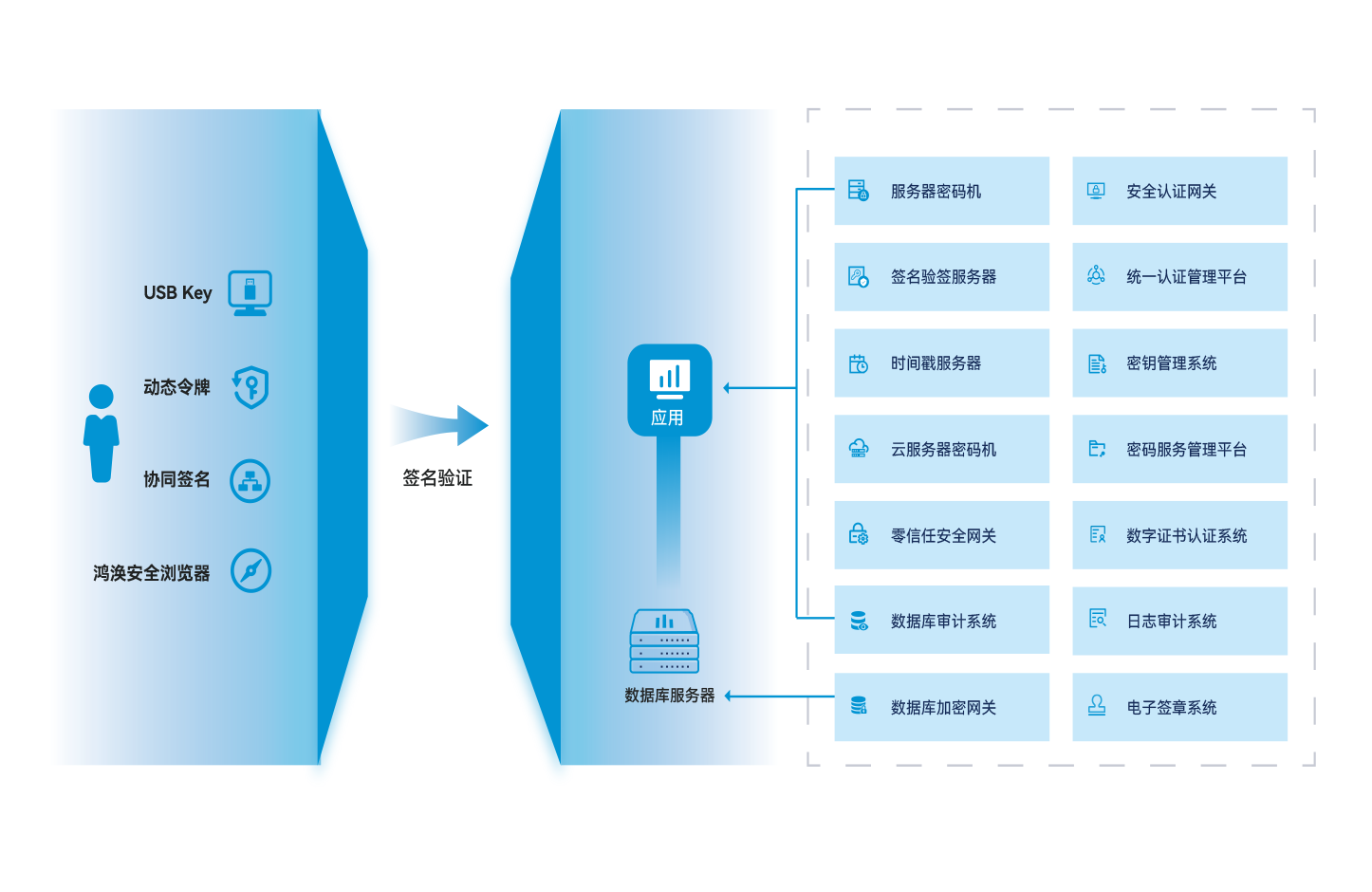 智能密码钥匙、综合安全网关、服务器密码机、签名验签服务器等密码产品解决应用系统面临的身份认证、安全传输、安全存储和数据完整性等问题。