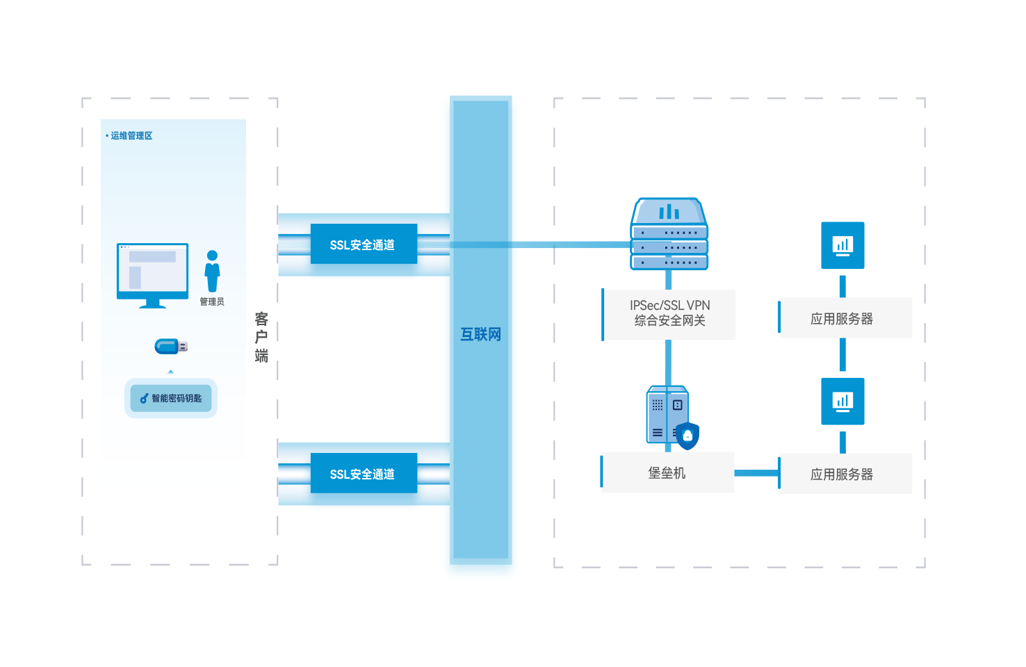 智能密码钥匙、IPSec/SSL VPN 综合安全网关和堡垒机解决身份鉴别以及远程管理通道安全问题。